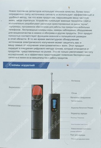 Режимы работы: 1) Поиск источников э/м излучения - сигналов от WIFI, GMS скрытых шпионских мини видео камер, прослушки; радио микрофонов, жучков маяков, УКВ радиостанций, передачи данных на сервер от GPS трекеров. 2) Поиск источников магнитного поля GPS трекеров слежения. 3 Визуальный поиск шпионских скрытых видео камер по отблескам линз микрообъективов.