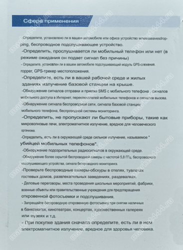 3. Применение: | обследование помещений, автомобиля и пр. с целью исключить возможность получения злоумышленниками получение информации конфиденциального характера и компрометирующих материалов. |